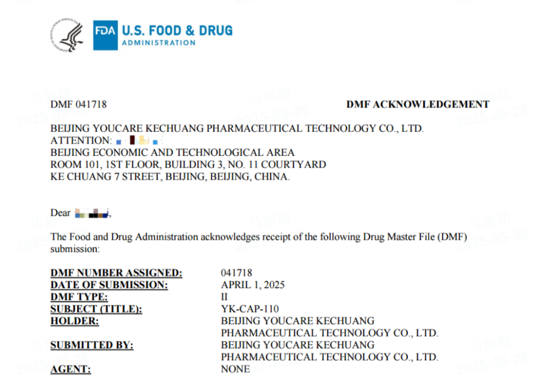 克日,,,, ,,1xBET·Signup(中国区)-官方网站子公司北京1xBET·Signup(中国区)-官方网站科创医药科技股份有限公司自主研发的一款Cap1新型帽子结构(YK-CAP-110)收到美国食物药品监视治理局(FDA)揭晓的DMF(药物主文件)备案确认函,,,, ,,完成DMF注册备案(备案号:041718)。。。 。。。。。